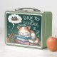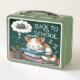 Esta encantadora lonchera muestra a un gato somnoliento enrollado en un montón de libros soñando con ratones. El diseño celebra el amor por la lectura y la compañerismo felino. "DE VUELTA A LA ESCUELA" está escrito en una fuente clásica serif. Ideal para las lombrices de biblioteca.