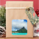 Pegatina de recuerdos fotográficos cuadrado con un resort sobre el agua en la fantástica laguna turquesa de Bora Bora con el monte Otemanu al fondo en la Polinesia Francesa cerca de Tahití. ¡Un gran destino para una luna de miel!
