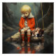 Un niño con una chaqueta roja sentado en una roca por un cuerpo de agua tranquilo y reflexivo, acompañado por su perro. El chico parece triste y su fiel compañero se compadece con él. El lugar está situado en un bosque místico de ambiente tranquilo. Photoshop CS5 de arte digital