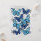 Composición vertical de mariposas morfo realistas, azules y blancas sobre fondo texturado gris. Mariposa morfo azul.