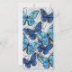 Composición vertical de mariposas morfo realistas, azules y blancas sobre fondo texturado gris. Mariposa morfo azul.