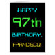 Este sencillo y divertido diseño de tarjetas de felicitación de cumpleaños incluye un mensaje como "¡FELIZ CUMPLEAÑOS 97, FRANCISCO!". Su aspecto está inspirado en el campo de la informática digital. El nombre en la parte delantera y el mensaje en el interior se pueden personalizar. Podría ser enviado o dado a alguien que esté celebrando su cumpleaños noventa y siete, y que tal vez trabaje (o trabaje antes de la jubilación) como administrador de bases de datos, programador de computadoras, administrador de redes, desarrollador de software, ingeniero eléctrico, o que de otra manera disfrute usando computadoras. [~Z0000100]
