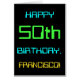 Este sencillo y divertido diseño de tarjetas de felicitación de cumpleaños incluye un mensaje como "¡FELIZ 50 cumpleaños, FRANCISCO!". También presenta una apariencia divertida inspirada en la computación digital. El nombre en la parte delantera y el mensaje en la parte interior se pueden personalizar. Se podría enviar o dar a alguien que esté celebrando su cincuentenario, y que tal vez trabaje como programador de computadoras, desarrollador de software, administrador de bases de datos, administrador de redes, ingeniero de electrónica, o que de otra manera disfrute usando computadoras. [~Z0000100]