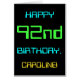 Este sencillo y divertido diseño de tarjetas de felicitación de cumpleaños incluye un mensaje como "¡FELIZ 92º CUMPLEAÑOS, CAROLINE!". También presenta un aspecto divertido inspirado en la computación digital. El nombre en la parte delantera y el mensaje en la parte interior se pueden personalizar. Se podría enviar o dar a alguien que esté celebrando su cumpleaños noventa y dos, y que tal vez trabaje (o trabaje antes del retiro) como administrador de sistemas de computadora, programador de computadoras, administrador de redes, ingeniero eléctrico, desarrollador de software, o que de otra manera disfrute usando computadoras. [~Z0000100]