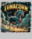 Traído a la vida al estilo de un impresionante poster de películas es este ilustracion dramático de un majestuoso "TUNACORN", una fantástica criatura que combina las características de un unicornio y un atún. La criatura galopa hacia delante con poderosas patas delanteras, su cuerpo flotante azota en el viento, mientras que su trasero se transforma perfectamente en una cola de atún que se alza grácilmente detrás, iluminada por una luz direccional fría desde la izquierda. Detrás de la fantástica bestia, una vorágine de nubes de tonalidad fría, estrellas brillantes y un cielo profundo y oscuro crean un telón de fondo dinámico. La composición general enfatiza el impulso hacia adelante de la criatura, con una perspectiva ligeramente angulada que atrae al espectador hacia la escena y resalta el marcado de oro dimensional grabado de "TUNACORN" que se encuentra encima de su cabeza. Humorística, comedia, animal, curioso, animal.