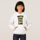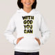 Este diseño de capucha chica tiene las palabras "Con Dios que puedas" en una imagen de burbuja más letras negras y contorno de sombra amarilla con un estilo de tipografía en este tema basado en la fe. Este capuchón está hecho de una mezcla de algodón de 10 oz y mangas de ajuste de la cara de algodón al 100% y agujeros de armadura con puntas de aguja dobles y banda inferior para mayor durabilidad con una imagen de coincidencia más pequeña impresa en la parte posterior.