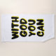 Este diseño de toallas de playa tiene las palabras "Con Dios que puedas" en un estilo de burbuja impreso más letras negras y contorno de sombras amarillas con un estilo de tipografía en este tema basado en la fe. La parte delantera de esta toalla es una mezcla de poliéster, la parte posterior es 100% algodón con una impresión de sublimación vibrante diseñada para durar. Disfrute de esta toalla para su próximo picnic, escapada a la playa o cualquier actividad al aire libre que pueda asistir a todas las toallas son lavables a máquina con el recomendado tumble de baja velocidad seco.