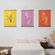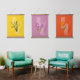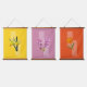 Flores de primavera. Las flores se colocan sobre dos rectángulos escalonados que difuminan el color de fondo en un 30%. La parte izquierda de la parte superior muestra dos naranjas y folletos amarillos sobre fondo amarillo. El centro muestra dos lilos de lavanda y rosa sobre el fondo de lavanda. Colgar a la derecha muestra una flor caléndula naranja en el fondo naranja.
