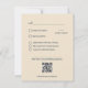 Esta elegante tarjeta RSVP de la colección Sunset Serenade continúa la perfecta armonía de la suite de invitados con su riqueza cultural y su estilo contemporáneo. ✨ diseño frontal: calidez radiante y romance, el frente presenta el característico fondo acuático Sunset Serenade - un brillante cielo naranja-dorado con arañas de templo siluteado y florales vibrantes que evocan el espíritu de una celebración sagrada. El mensaje, "Por favor háganlo saber antes del 03.07.20XX", se presenta en una fuente elegante y moderna, recordando con suavidad a los invitados a responder mientras se mezclan maravillosamente en la poesía visual de la tarjeta. 📝 lado inverso - Pensativo y práctico: La parte posterior ofrece un diseño crema limpio y refinado para que sus invitados: indicar asistencia Nota el número de invitados Compartir cualquier preferencia dietética u otras notas especiales Hay flexibilidad para la selección de comidas o instrucciones adicionales dependiendo de las necesidades de su celebración, lo que permite a las parejas adaptar la experiencia a su visión. 📱 opción digital sin inconvenientes: un escaneado código QR en la parte inferior dirige a los invitados a su sitio web boda o formulario RSVP, haciendo que el proceso de respuesta sea fácil y moderno. Debajo, una nota educada dice: "Para responder en línea, escanee este código QR". Combinando el diseño atemporal con una función fácil de usar, esta tarjeta RSVP es una combinación perfecta para parejas que buscan elegancia, tradición y comodidad, todo en uno.