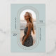 Un diseño de invitación de graduación simple y elegante con influencias artísticas deco, con el nombre de tu graduado, el curso de graduación y la escuela, organizado alrededor de un elemento arqueado adornado con arte de la línea de Relieve metalizado oro rosa, con una foto vertical en el centro. Personalice la parte posterior con un mensaje personalizado y una foto adicional.