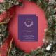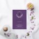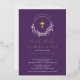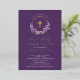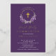 Hermosas invitaciones de Relieve metalizado dorado de la Primera Comunión con una corona de lino lavanda y una cruz de Relieve metalizado dorado sobre un fondo morado profundo. Invierta nuestra invitación para ver una coordinación de nuevo para un toque especial.