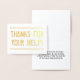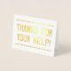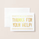 Este diseño de tarjetas de felicitación de agradecimiento para Relieves metalizados dorados incluye el mensaje "GRACIAS POR TU AYUDA!" en una letra de estilo angustiado en el frente, junto con un mensaje personalizado en el interior. Podría ser usado para mostrar gratitud a alguien que ha hecho algo especial.