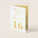 Esta tarjeta de cumpleaños "Sweet 16" es aún más dulce porque tiene un hermoso Relieve metalizado de oro en la parte delantera de la tarjeta. Las palabras "(Nombre) Feliz" aparecen justo encima de las palabras "Dulce 16" que está rodeado de confeti de Relieve metalizado dorado. Dentro de la tarjeta hay un fondo dorado más ligero para el confetti negro y las palabras: "¡Nadie brilla como tú! Feliz 16º cumpleaños". ¡Esta tarjeta de 16 años es una que ella siempre recordará! Derechos de autor Kathy Henis