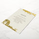 Una bonita y clásica tarjeta de gabinete con cremas y elementos de Relieve metalizado dorado. Ideal para una boda formal y elegante con un toque vintage.