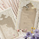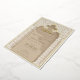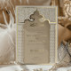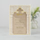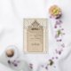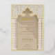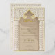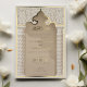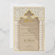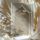 Esta invitación es una lujosa declaración, perfecta para parejas que buscan combinar el diseño islámico tradicional con la elegancia moderna. Su acento dorado en el Relieve metalizado ilumina el intrincado motivo de encaje, creando un sorprendente contraste con el fondo tauro y beige. Los elementos arquitectónicos hacen eco de la grandeza de la entrada de una mezquita, con columnas con motivos de chevron enmarcando la tarjeta y un arco bellamente estilizado coronando el texto. El uso de crema, crudo y tonos dorados exuda opulencia, mientras que el detalle de las obras refleja un profundo respeto por la cultura. Esta invitación promete una celebración donde convergen la belleza atemporal y el estilo contemporáneo para crear una experiencia inolvidable.