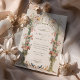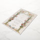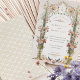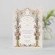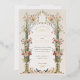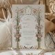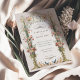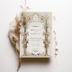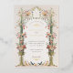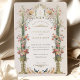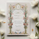 Esta invitación a la boda es un lienzo romántico pintado con los suaves tonos de un jardín inglés. Las flores de color rosa, coral y marfil de claveles caen en cascada por las urnas doradas ornamentales, simbolizando el crecimiento y florecimiento del amor. La arcada florida, adornada con una delicada vegetación, enmarca las iniciales de la pareja en un estilo victoriano tradicional, creando una atractiva entrada para la celebración de la unidad. Debajo, se despliega una pintoresca escena con una familia de pájaros, haciendo eco del tema de la unión. Este diseño refleja la esencia de la elegancia atemporal, perfecta para la pareja que desea combinar el encanto clásico de una época pasada con la alegre promesa de su futuro juntos.