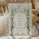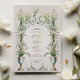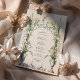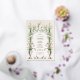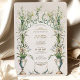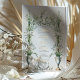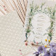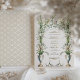 Esta invitación a la boda es una celebración de la elegancia victoriana, mostrando la serena belleza de las lilas de la calila en pleno florecimiento. Una urna clásica en tonos azules y crema, adornada con delicados azulejos de oro, es la pieza central, desde la que las lilas suben hacia un armonioso monograma de vid verde. La composición está equilibrada con un par de palomas pacíficas en la base, simbolizando amor y fidelidad. La combinación de tonos crema, sabio y azul suave es atemporal, con toques de taupe y oro, lo que promete un acontecimiento de elegancia y encanto histórico.