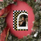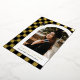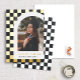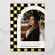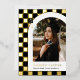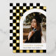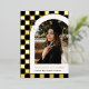 Esta moderna y única invitación de graduación tiene un Relieve metalizado de oro real y un fondo de cuadros negros que destaca una fotografía del graduado enmarcado en un arco blanco con el nombre del graduado y la escuela debajo. Con el año de graduación se muestra astutamente un pequeño límite de graduación en el fondo comprobado. La parte trasera tiene un divertido patrón a juego marcado en blanco y negro.