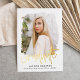 Esta invitación de graduación de moda presenta la foto del graduado enmarcada en un diseño de máscara texturizada, con "Graduado" elegantemente mostrado en escritura de Relieve metalizado dorado manuscrita para un aspecto moderno y moda. Personalice esta elegante invitación de graduación de fotos agregando el nombre del graduado, el nombre de la escuela y el año de graduación para crear un recuerdo memorable. El reverso presenta un audaz diseño rayado en blanco y negro, lo que convierte a esta invitación en una opción sobresaliente tanto para los graduados de secundaria como universitarios. Comparta este emocionante hito con la familia y amigos de una manera única y sofisticada.