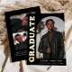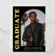 Invitación de graduación elegante y de moda que presenta la foto del graduado en la parte delantera con un marco fotográfico en arco de desvío. "Graduado" se muestra en negrita con letras de Relieve metalizado dorado en un fondo negro. Personalice la parte delantera de la invitación de graduación de fotos en arco agregando el nombre del graduado, la escuela y el año de graduación. La tarjeta se revierte para mostrar otras 3 fotos con espacio para texto personalizado como futuros planes universitarios, planes de carrera, detalles de la fiesta de graduación, etc. La invitación de graduación de Relieve metalizado de oro es perfecta tanto para graduados de secundaria como universitarios.