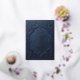 Este diseño de invitación rezuma elegancia y sofisticación, con un fondo azul oscuro decorado con un estampado plateado intrincado. El foco principal son las iniciales doradas de la pareja, bellamente escritas. Los detalles de la boda se muestran de manera prominente en fuentes blancas contrastantes, invitando a los invitados a unirse a la fiesta.