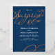 Esta moderna y elegante invitación de sorpresa de cumpleaños 60 aniversario presenta las palabras "sorpresa 60" en tipo de letra de lámina dorada rosa con un diseño giratorio a juego en la esquina inferior derecha. El fondo es azul marino, pero se puede cambiar a cualquier color de su elección. Personalice esta invitación de moda con el nombre y la información de la fiesta.