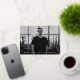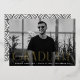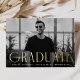 Simple invitación de graduación con la foto horizontal del graduado con "Graduado" exhibida en Relieve metalizado dorado con letras modernas de arte deco. Personalice la parte delantera de la invitación de graduación con fotos agregando el nombre del graduado, la escuela y el año de postgrado. La invitación se invierte para mostrar un diseño giratorio geométrico en blanco y negro.