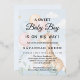 Encantadora invitación de baby shower niño con una simpática jirafa en acuarela sosteniendo globos pastel en un suave fondo azul claro. Nubes blancas esponjosas, estrellas amarillas y delicado follaje verde enmarcan el diseño, dejando amplio espacio para detalles personalizados del evento. Esta invitación equilibrada y alegre es perfecta para baby showers modernos, combinando elementos juguetones de acuarela con un estilo elegante e invitador.