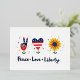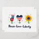 Invita a tus invitados con positividad y estilo patriótico. 🎉🕊️ Esta invitación presenta una ilustración adorable de la señal de la mano de la paz, corazón y girasol — cada uno decorado con patrones creativos rojos, blancos y azules. Debajo, el texto juguetón dice “Paz • Amor • Libertad” con estrellas dispersas. ¡Perfecto para barbacoas en el patio trasero, desfiles, fiestas familiares o eventos del 4 de julio para niños! 🇺🇸🎆