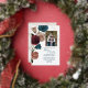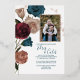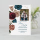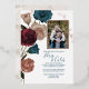 Se elevó la textura de la hoja de oro rosa sobre rosales verde azuladas, burdeos y polvorientas. El marco fotográfico purpurina es un bello toque final a esta vintage invitación a la boda floral. Versátil para colores verde azulados, dorados y bodas burdeos.