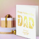 Relieve metalizado dorado, tarjeta del día del padre con tema de béisbol con el saludo de su personalizado dentro. El anverso de la carta está escrito en una tipografía de Relieve metalizado dorado, decorada con jugadores de baloncesto. La frase dice "feliz día del padre papá... que todos tus chismes se hagan realidad". El mensaje interior es totalmente editable.