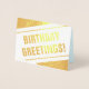 Este diseño minimo y simple de tarjetas de felicitación de cumpleaños de Relieve metalizado dorado incluye el mensaje "BREETINGS DE CUMPLEAÑOS!" en la parte delantera, junto con un mensaje personalizado en el interior. Se podría usar cuando se celebra el cumpleaños de alguien.