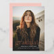 Anuncie el logro de su graduado con esta invitación de graduación simple y elegante, que incluye una foto vertical del graduado con "Graduado" exhibida en una impresionante carta moderna de Relieve metalizado de oro rosa. Personalice el diseño agregando el nombre del graduado, el nombre de la escuela y el año de graduación para un toque especial. La parte trasera de esta hermosa invitación de graduación de Relieve metalizado de oro rosa muestra un suave fondo rosa rubor, complementando perfectamente el diseño. Ideal para graduados de secundaria y universitarios, esta elegante tarjeta es una forma de moda de compartir las emocionantes noticias con amigos y familiares.