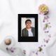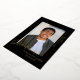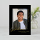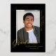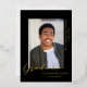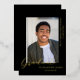 Un diseño sencillo, moderno y elegante para una invitación de graduación con fondo negro. La tarjeta tiene un espacio para una foto del graduado y muestra la palabra GRADUATE al final de la foto en Relieve metalizado de oro real. Debajo de la foto está el nombre del graduado y en el lado derecho de la foto está el nombre de la escuela y clase de 20XX. El negro y el oro forman una combinación elegante.
