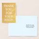 Este sencillo y audaz diseño de tarjetas de felicitación con Relieve metalizado dorado incluye el mensaje "¡GRACIAS POR TU AYUDA!" en el frente, junto con un mensaje personalizado en el interior. Podría ser usado para ofrecer gracias a alguien que ha hecho algo bueno.