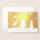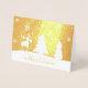 Tarjeta de saludo de Relieve metalizado dorado con ilustracion de Navidades abstractos: siluetas blancas de reno, árbol, muñeco de nieve y copos de nieve con Feliz Navidad con fondo rojo.