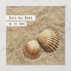 Anuncia tu boda de verano o boda de playa con esta invitación de anuncio de guardar la fecha con un concepto romántico que presenta un par de conchas marinas en la arena.