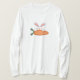 Un conejito blanco lindo con una zanahoria anaranjada grande en las camisetas adaptables del diseño de Pascua y la otra ropa.