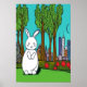 Un conejo blanco sobre la hierba verde del parque, con flores rojas y árboles detrás, también se puede ver la ciudad y el cielo azul claro, el arte de estilo personalizado. Esto es un arte generado por IA.