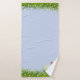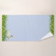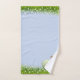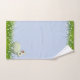 Un juego de toallas de baño azul claro con un conejo blanco y flores. Conejo sólo de un lado. Sólo las flores son bicicletas.