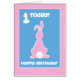 Una tarjeta de cumpleaños divertida para un niño de un año, con un cheque rosado lindo conejo en un fondo azul con un borde rosa y '1 hoy - Feliz cumpleaños' con letras blancas. Por favor, siéntase libre de personalizar el mensaje interno.
