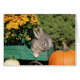 Un conejo gris en un vagón verde de otoño, calabazas y Mamáes alrededor, podría ser tema de Halloween o Día de Acción de Gracias