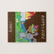 Conejo colorido de Pascua, cesta y rompecabezas de la casa con nombre personalizado para los niños.
