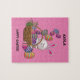 Conejo colorido de Pascua en cesta con rompecabezas de huevos y nombre personalizado.