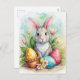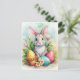 Encantosa postal de acuarela con un conejo de Pascua rodeado de flores primaverales y huevos pintados brillantes. Tonos pastel suaves y detalles delicados crean una atmósfera de acogimiento, alegría y fiesta primaveral. ¡Una imagen perfecta para los saludos de Pascua!