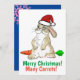 Un conejo divertido con el sombrero de Santa te envía los mejores saludos navideños. Feliz Navidad, Muchas Zanahorias! Una tarjeta de Navidad o días festivos personalizable para cualquier persona. Un texto de plantilla en la parte posterior de la tarjeta para tu mensaje personal. Puedes cambiar o eliminar tres líneas de texto de forma independiente. Utilice el botón "Personalizar" para cambiar el tipo de letra, color o ubicación. ¡Simplemente personaliza y compra uno y sé feliz!