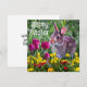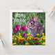Esta tarjeta plana presenta un diseño de vida silvestre primaveral, con un conejo salvaje y flores de tulipán. Hay un saludo de vacaciones "Feliz Pascua" en la parte delantera y en la parte trasera. Puede comprar tal como se muestra o editar para agregar su propio texto.