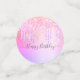 Confeti giratorio y femenino para tu mesa de fiesta de 18 años. Un fondo morado y rosa. Decorado con purpurinas de color arcoiris gotean en color violeta, rosa. Personalice y agregue una fecha y un nombre/edad de 18 años. Letras de color gris. Algunos confietti con nombre y fecha, otros con el texto: Feliz cumpleaños escrito con un moderno guión escrito a mano con chispas. Añade tu propia foto en dos de las fichas.
