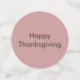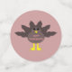 Este impresionante confeti de mesa presenta un personalizado de pavo con grandes ojos negros, un pequeño pico amarillo y plumas de cola pegadas. Los pies están en direcciones opuestas, lo que hace que el pavo parezca ridículo. El pavo tiene un texto rosado en el vientre que dice "Feliz Día de Acción de Gracias" y parece que las plumas han sido arrancadas para revelar el mensaje.