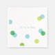 Estas servilletas de papel festivo tienen puntos de confeti azul y verde agua dispersos sobre un fondo blanco con azul acuático "es un niño" editable. Perfecto para un bebé que revela la ducha.